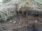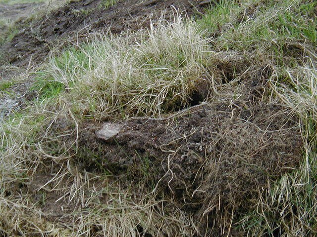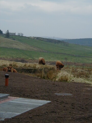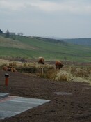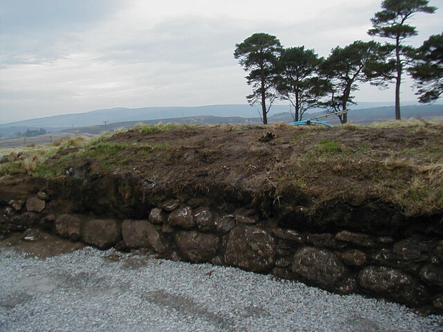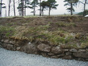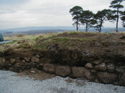 Subsequent development put house inside the enclosure. Site visit by HAW after work taken place to examine what had been revealed. (landscaping to house had stripped area as far as wall that lay on inside of enclosure bank, ground surface no longer visible. Area to N had been stripped for farm building, natural surface revealed). No obvious finds for dating, but Mr O'H had found a bead a combination of ceramic & lead that is with Gask Project to be dated. Sections were cut through the bank, that on examination looked v slight, but prob built of now degraded turves (see photos for sections). Wall in front up to about 3 courses (1m high), large unworked local stone. Curve seems more circular where survived than curved rectangular. Southern part of enclosure has sub rect earthwork within it. On 1st ed (on which part of above enclosure depicted), there is a building in this area with small adjoining enclosure. <1>