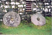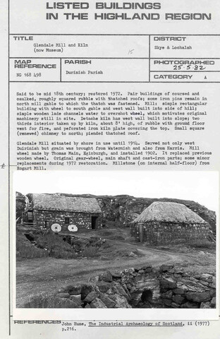 A 19th century rectangular rubble building, thatched, with a single pair of 32in (0.81m) stones driven by an all-iron, 6-spoke overshot wheel, 25in wide by 12ft diameter (1.25 [0.6] by 3.66m), built by A & J Main and Co Ltd, Edinburgh. The millstones, from Rogart Mill, Sutherland are on a half-floor. There is a detached thatched kiln, with hipped roof. Restored 1968-9. (Hume 1977)