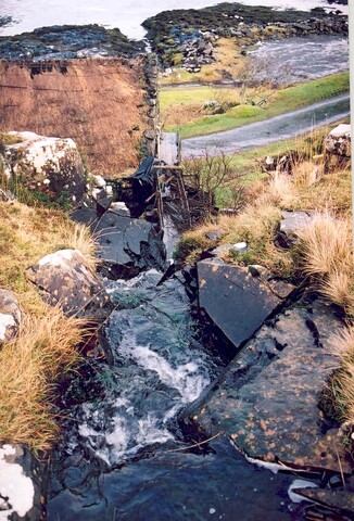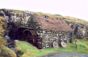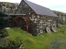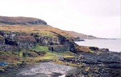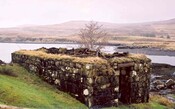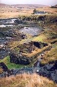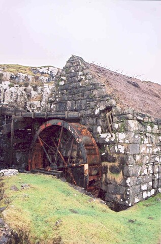 Watermill, mid-18th century. A rare survival for this date, built of roughly squared and coursed rubble against the rocky flank of a waterfall at the head of Loch Pooltiel. Iron wheel on south gable with machinery dated 1902, overshot by a wooden lade; detached kiln. Originally thatched, it was slated by 1914 , round the time it ceased use. The present straw thatch dates from a 1970s restoration and needs urgent attention. (Miers 2008)