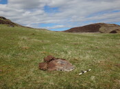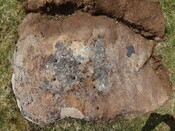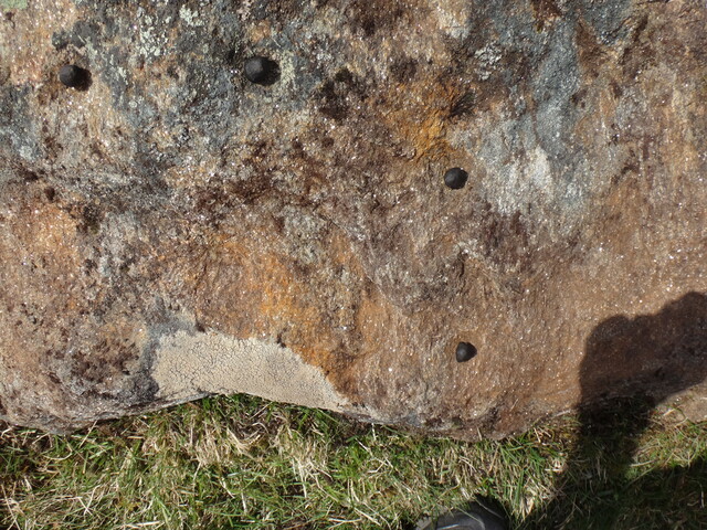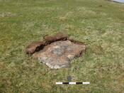 This is a low-lying oblong rock, partially covered by grass turf, with a deep fissure at the northwest section. The 1.35 x 0.92m panel is otherwise smoothly rounded, has a rough surface and with its longest axis northsouth. Its highest part above the roughly level ground is 0.27m towards the southern edge. There are (at least) 6 simple cups in the centre and eastern parts of the panel. They measure approximately 3-5cm across, and 2-3cm deep, and the lowest cupmark is almost at the edge of the rock surface. <2>