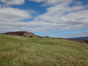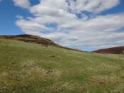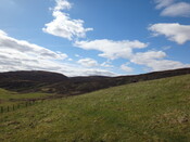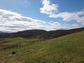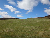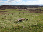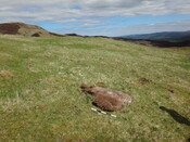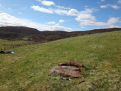Site V165; Cup-marked Stone (Urchany 6 in Scotland’s Rock Art Project database). This cup-marked stone sits low on a gently sloping and undulating south facing slope looking over the Breakachy Burn. From this grassy field, there are extensive views south towards the low hills of Breakachy about 3kms away, and beyond them to the undulating high ground above Loch Ness. The panel lies at the SE corner of an extensive area of enclosed improved grassland. The low-lying oblong stone, partially covered by grass turf, has a deep fissure at the NW section. The 1.35 x 0.92m stone is otherwise smoothly rounded, has a rough surface and with its longest axis NS. Its highest part above the roughly level ground is 0.27m towards the southern edge. There are (at least) 6 simple cups in the centre and eastern parts of the panel. They measure approximately 3-5cm across, and 2-3cm deep. The lowest cup is almost at the edge of the rock surface. <1>