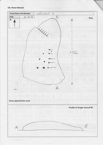 This panel was recorded as part of the ScRAP (Scotland’s Rock Art project) by members of NoSAS in May 2018. This rock panel sits low on a gently sloping and undulating S facing slope looking over the Breakachy Burn. From this grassy field, there are extensive views south towards the low hills of Breakachy about 3kms away, and beyond them to the undulating high ground above Loch Ness. The panel lies at the southeast corner of an extensive area of enclosed improved grassland. The enclosure was originally with a turf bank. This has been superceded by a post-and-wire fence. Towards the top (northern) part of this enclosure lies the derelict remains of a long low building of two conjoined houses associated with stone-built enclosure dykes. This represents the historical settlement of Coul na Bottach, part of the Lands of Urchany, in which a family was living at the time of the 1871 census. A well-known large cup-marked stone, Urchany 1, sits just in front, to the south of the building, which is approximately 150m NE. 1.5kms east across the Breakachy Burn, is Dun Mor, an iron age fort. The main settlement of Urchany and another four cup-marked stones, lie 1km to the west.